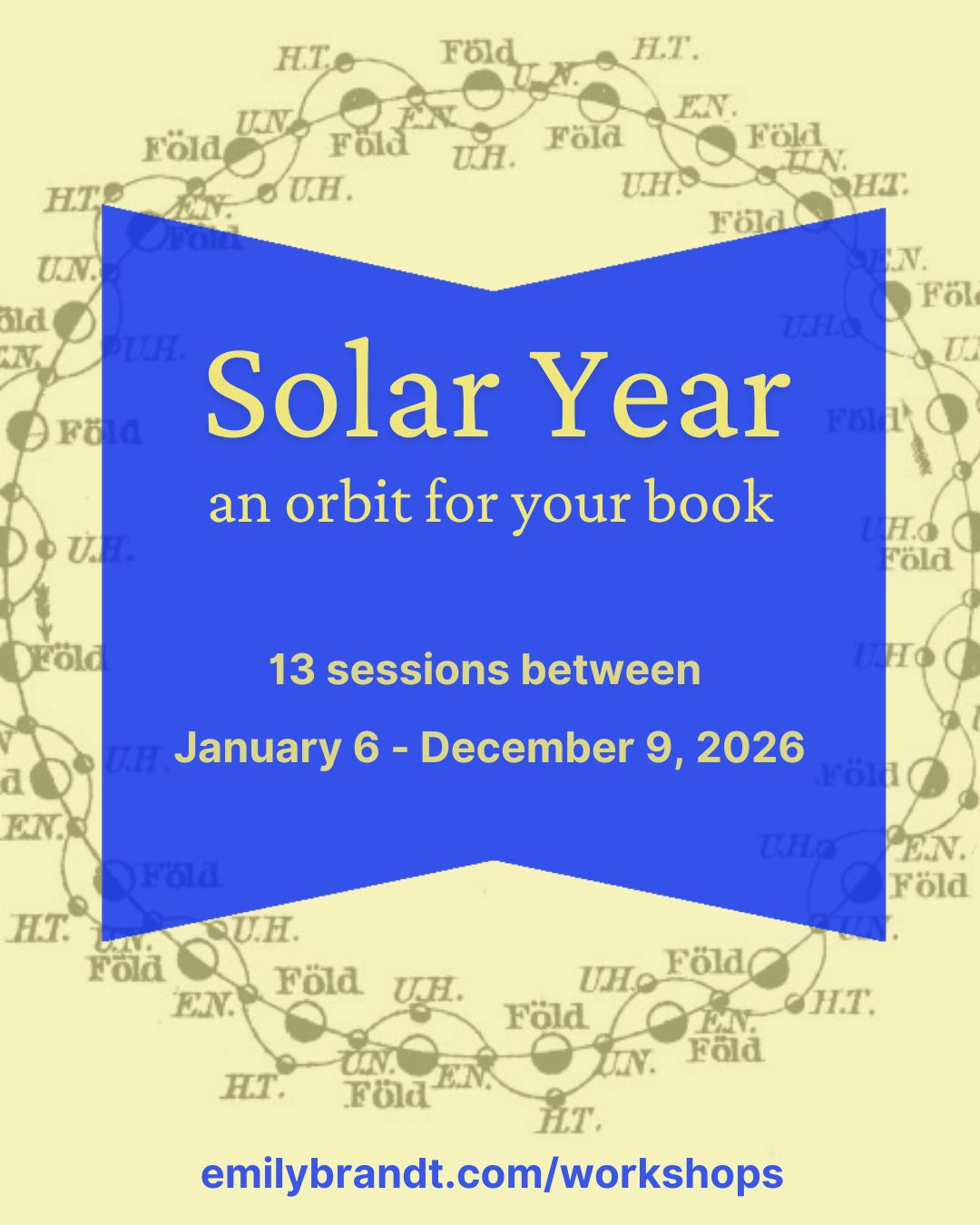 The next cohort of SOLAR YEAR starts in January. We’ll meet 12 mornings and 1 evening in 2026 to support your book projects. Secure your spot! (Two half scholarships left!)